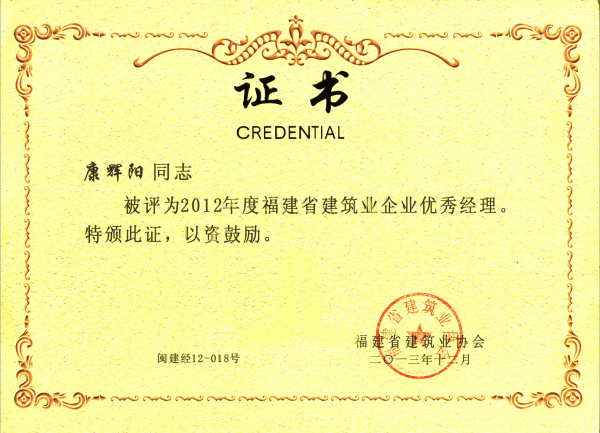 康輝陽同志2012年度福建省建筑業(yè)企業(yè)優(yōu)秀經(jīng)理